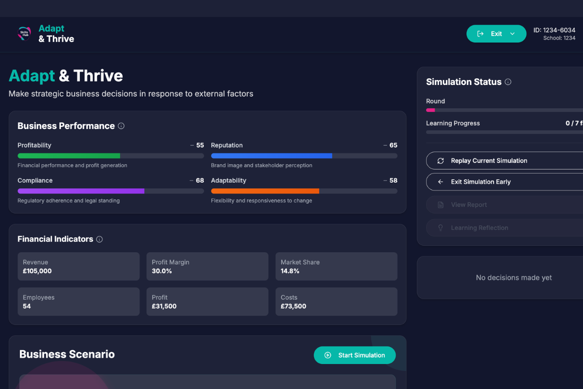 Students develop capabilities through applied business simulations, building an evidence portfolio for UCAS and job applications. Teachers get automated intervention alerts and Ofsted-ready cohort analytics, with zero extra workload.